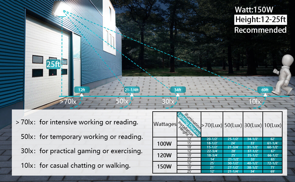 150W 20010LM - The outside wall lamp suggested installation height is 12-25ft. Suggested human activities in a radius of 69-72ft and vehicle heading of 900ft for safety, perfect for entryway, shopping mall, office building as commercial lighting.